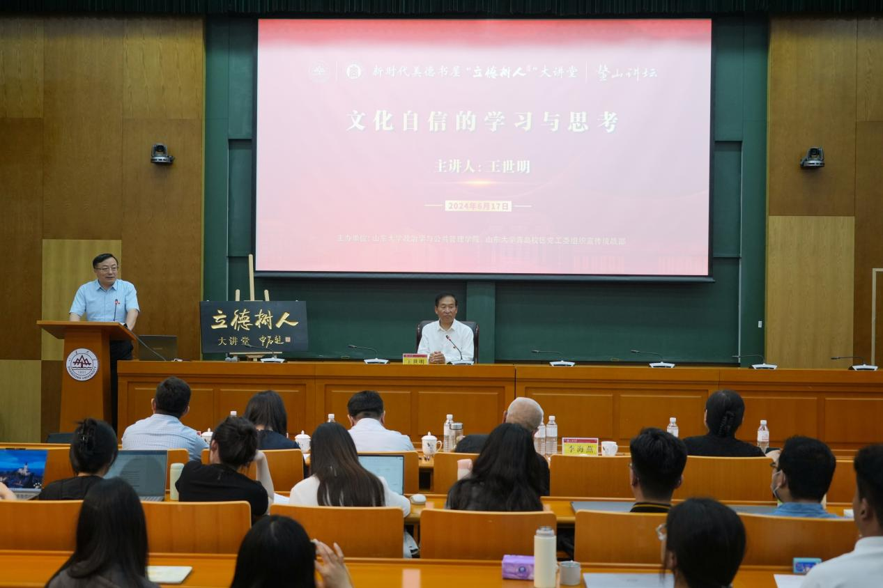 6月17日,新时代美德书屋“立德树人”大讲堂暨鳌山讲坛在304永利集团官网入口青岛校区华岗苑南楼举行。中共中央宣传部原副部长、第十三届全国政协文化文史和学习委员会副主任王世明做客讲坛。《红旗画刊》原总编辑助理、山东省委党校“中华传统美德研究中心”主任兼首席专家殷昭俐,政治学与公共管理学院院长马奔出席报告会。报告会由304永利集团官网入口党委书记李海燕主持。