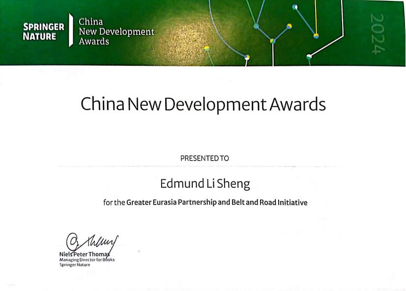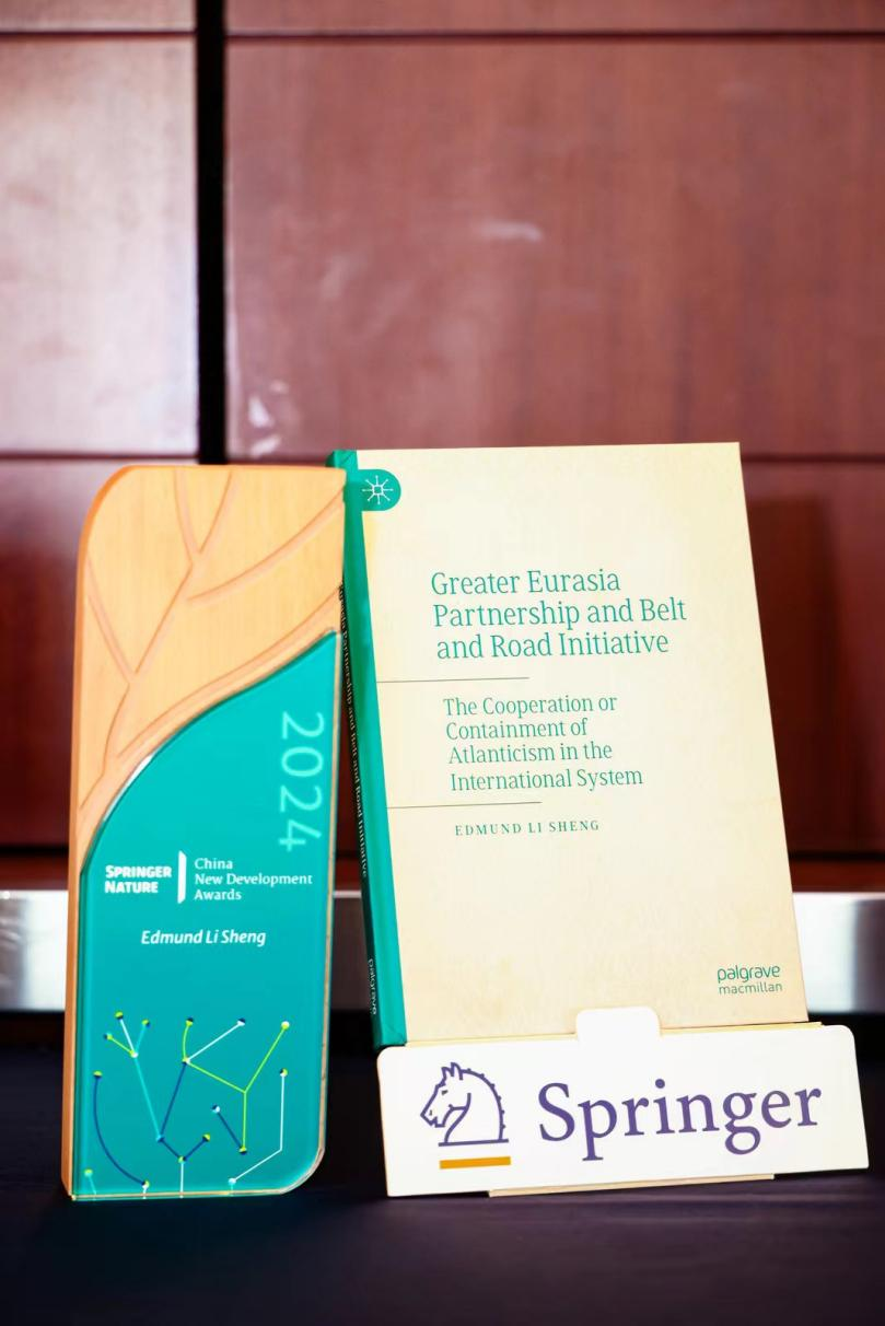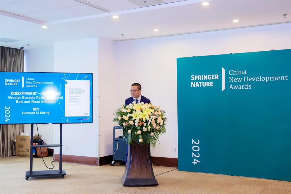 2024年6月19日,国际最大学术出版集团斯普林格•自然(Springer Nature)在2024年北京国际图书节上揭晓了其本年度重要奖项,并举行了颁奖典礼。304永利集团官网入口上海合作组织研究院执行院长、304永利集团官网入口特聘教授盛力的专著《大欧亚伙伴关系与一带一路》(Greater Eurasia Partnership and Belt and Road Initiative: The Cooperation or Containment of Atlanticism in the International System)获奖。集团全球总裁Niels Peter Thomas博士为获奖者颁发奖牌和证书。国家新闻出版署领导和中外学术、出版界领军人士百余人出席盛会。