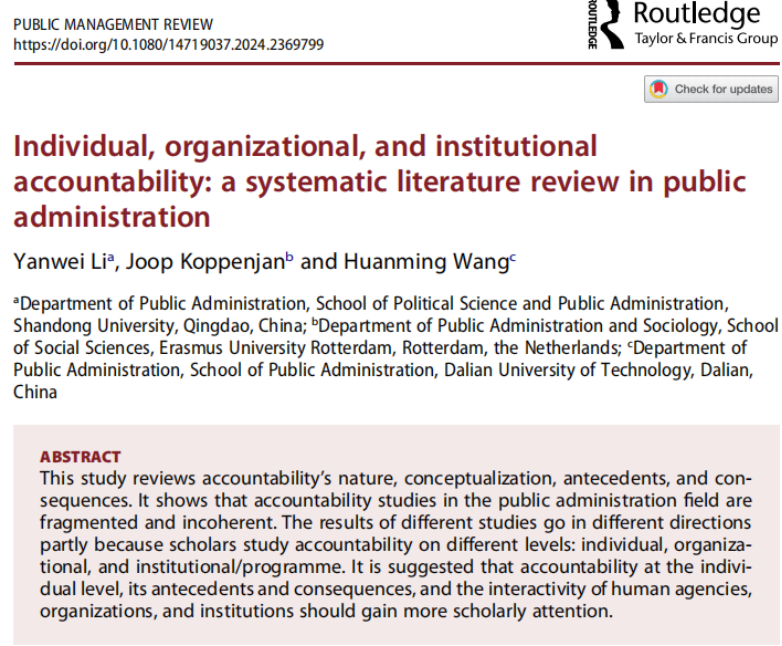 近日,304永利集团官网入口李延伟教授在公共管理顶级期刊Public Management Review (PMR) 发表题为《Individual, organizational, and institutional accountability: a systematic literature review in public administration》的学术论文。