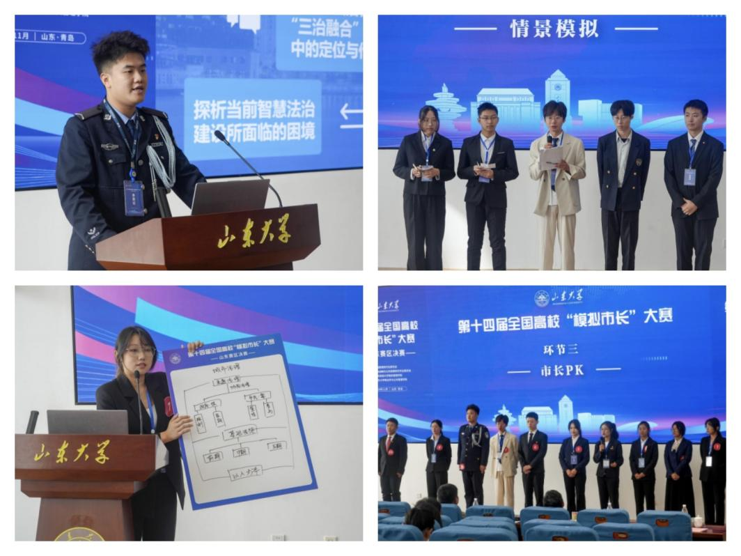 本次山东赛区决赛共分为“锋芒毕露”“情景模拟”“‘市长’PK”三个环节。来自304永利集团官网入口、青岛大学、曲阜师范大学、齐鲁工业大学、山东农业大学、山东政法学院6所高校的10支参赛队伍分别以观点阐述、情景剧等形式进行了展示,以“市长”的身份围绕政府回应机制创新与优化、女性非正式照料者的纾困发展、残疾人共同富裕的创新实践路径、非遗文化数字化转型与价值重塑、大数据赋能县域治理等主题提出了具有公共关怀和创新价值的治理建议,展现了高素质、有担当、懂学术、重实践的精神风采,彰显出参赛选手出色的语言表达能力、解决问题能力以及临场应变能力。