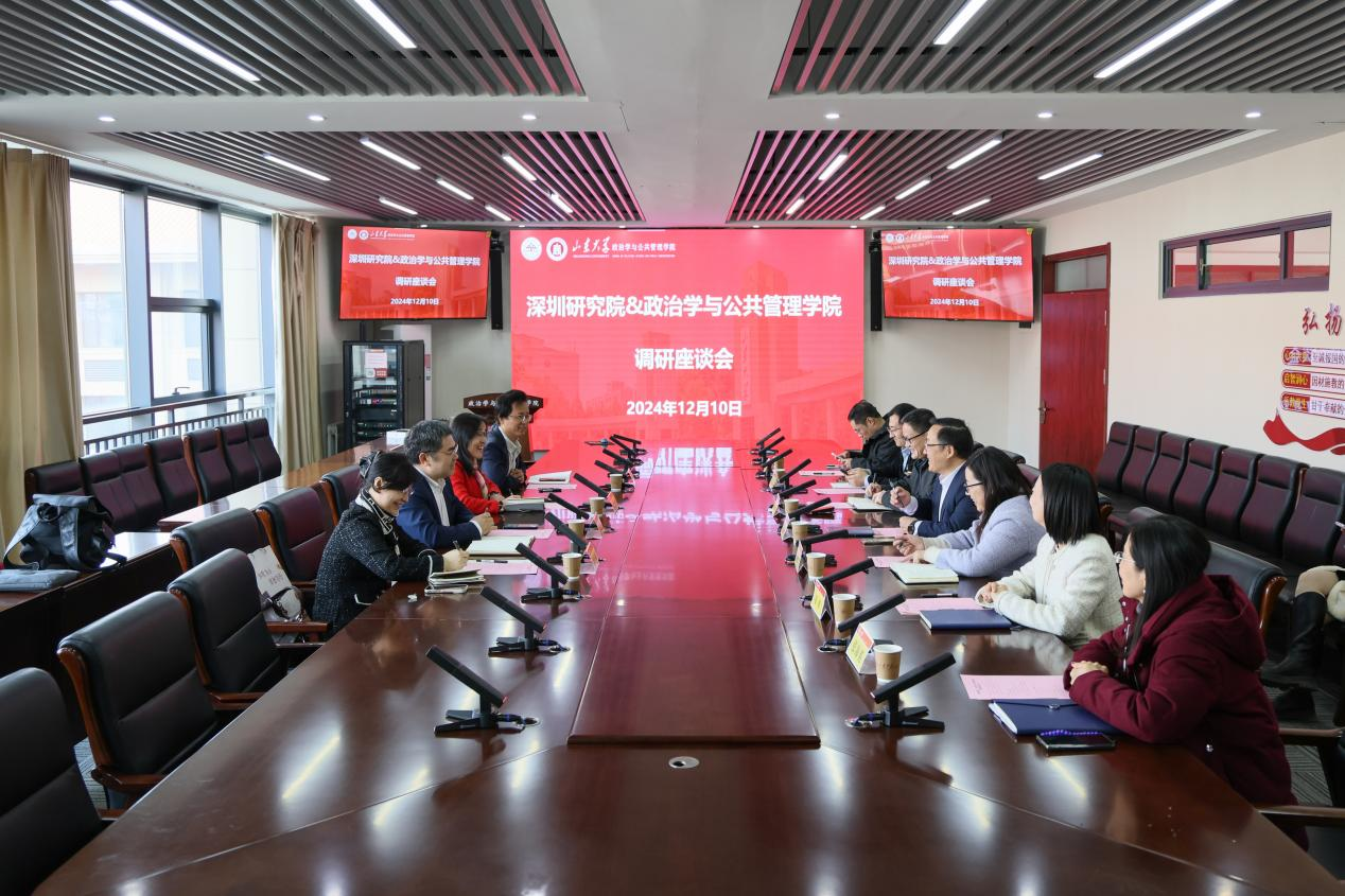 李海燕对深圳研究院一行来院交流座谈表示欢迎,并从学院历史沿革、建设成效及发展思路等方面介绍政管学院情况。他表示,政管学院近年在人才培养、学术科研、学科建设等方面成果突出,希望双方能进一步加强沟通对接,开展多种形式的深度合作,共同推动两院发展。双方领导班子成员就人才培养、科学研究、社会服务、智库建设、创业实践项目等方面进行了充分交流研讨并初步达成了合作意向。