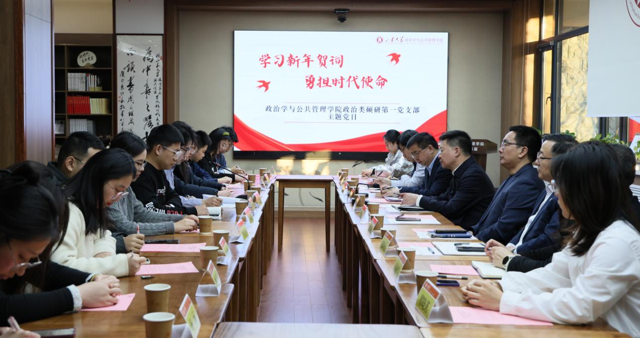 朱德建作总结发言。他对本次主题党日活动给予了充分肯定,强调学习新年贺词对于凝聚人心、鼓舞士气的重要意义。他表示,政管学院在过去一年里各项事业发展取得了突出成绩,希望下一步学院要锚定学校第十五次党代会确定的“一五七九”发展思路,保持闯的精神、创的劲头、干的作风,在学科建设、人才培养等方面取得更大的突破,有力服务治国理政,为中国式现代化建设贡献力量。他强调,青年一代与强国建设同频共振,政管学子既要怀抱梦想又要脚踏实地,既要敢想敢为也要善作善为,“做有理想、敢担当、能吃苦、肯奋斗的新时代好青年”,奋力书写为中国式现代化挺膺担当的青春篇章。
