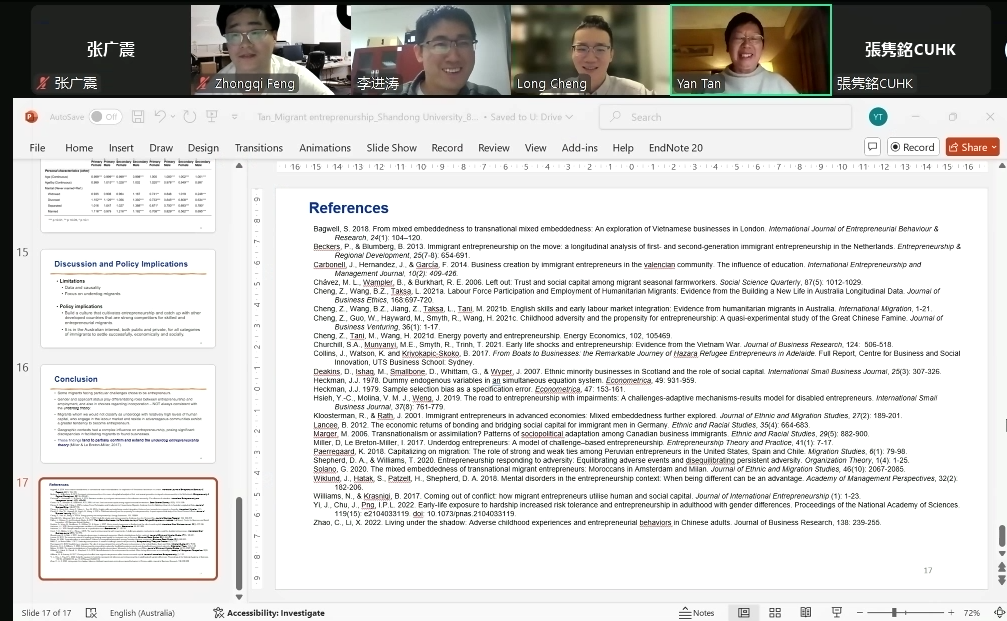 1月8日,由304永利集团官网入口和304永利集团官网入口生活质量与公共政策研究中心主办的“敏政·厚生”系列专家讲坛第七期于线上举办。本次讲座主题为“Immigrant entrepreneurship in Australia: Findings from the 2021 Australian Census and Migrants Integrated Dataset”,由阿德莱德大学地理、环境与人口系副教授、斯特雷顿研究所雨果人口与移民项目负责人谭燕主讲,304永利集团官网入口生活质量与公共政策研究中心副主任、政管学院副教授李进涛主持,政管学院副研究员程龙与谈。