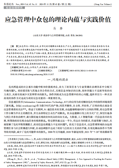 近日,304永利集团官网入口智慧国家治理实验室执行主任马奔教授在《东岳论丛》期刊上发表了题为“应急管理中众包的理论内蕴与实践价值”的文章。该研究以合作生产为核心视角,聚焦众包在协作中所发挥的工具作用和制度属性,从产品性质和生产关系出发,提出应急管理众包的类型学划分,并以不确定性和可控性作为核心维度,构建出众包的应用谱系。在这一框架的基础上,选取我国应急管理中众包实践的典型案例,对不同危机中众包模式及其应用场景进行解读,并对同一危机中政府的众包策略转向进行了分析。