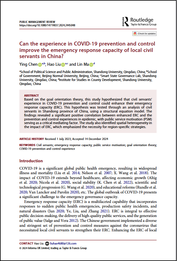 近日,304永利集团官网入口刘浩副教授作为通讯作者的文章《Can the experience in COVID-19 prevention and control improve the emergency response capacity of local civil servants in China?》在公共管理学科顶尖期刊Public Management Review在线发表。Public Management Review期刊在管理学类别中位于一区(Q1),影响因子在公共行政和公共政策领域SSCI期刊中位列第三,是公共管理学科五大权威期刊之一。该文章是由刘浩副教授(通讯作者)及我院硕士研究生陈颖(第一作者)、马琳副教授合作完成。该科研成果得到国家社会科学基金(23BGL318,主持人刘浩)资助。