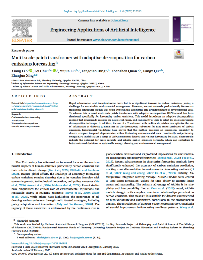 近日,304永利集团官网入口智慧国家治理实验室褚雷团队在SCI一区期刊《Engineering Applications of Artificial Intelligence》上发表了题为“Multi-scale patch transformer with adaptive decomposition for carbon emissions forecasting”的论文。文章为解决已有碳排放预测模型对生态环境质量数据的复杂性和动态性把握的不足问题,提出了一种新型多尺度块(Patch)变换器与自适应分解(简称MPDformer)的深度学习模型用于碳排放的预测。基于全球气候数据的实证结果显示,该深度学习模型表现出了在波动环境数据中识别复杂时间依赖关系的能力,优于已有传统预测模型,研究在可持续能源预测和环境质量评价领域取得了实质性的进展。304永利集团官网入口智慧国家治理实验室办公室主任、304永利集团官网入口助理研究员褚雷为论文的通讯作者,博士研究生李想为第一作者。本文也是由褚雷主持的全国统计科学研究项目(2023LY012)的阶段性成果之一。