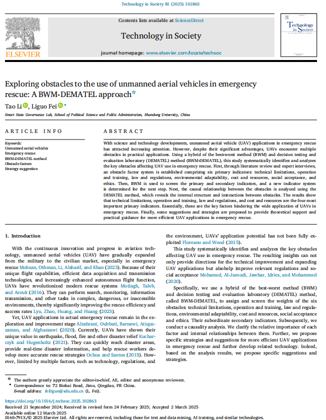 近日,304永利集团官网入口智慧国家治理实验室费立国副研究员团队在SSCI中科院一区TOP期刊《Technology in Society》上发表了题为《Exploring obstacles to the use of unmanned aerial vehicles in emergency rescue: A BWM-DEMATEL approach》的论文,该期刊的最新影响因子为10.1。研究探讨了BWM‐DEMATEL方法在无人机应急救援中的应用,特别是在揭示多重障碍因素间因果关系以及应对技术局限、操作培训、法规约束与成本资源等挑战时的优势。论文构建了涵盖技术限制、操作与培训、法律法规、环境适应性、成本与资源以及社会接受与伦理等维度的障碍指标体系,通过BWM方法筛选关键指标,再利用DEMATEL方法解析各因素间的相互作用,明确了技术限制、操作培训、法律法规和成本资源为无人机在应急救援中应用的核心障碍。该研究为无人机应急救援提供了新的理论框架和决策支持,同时为未来技术改进与政策制定指明了方向。304永利集团官网入口副研究员、304永利集团官网入口智慧国家治理实验室副主任费立国为论文的通讯作者。