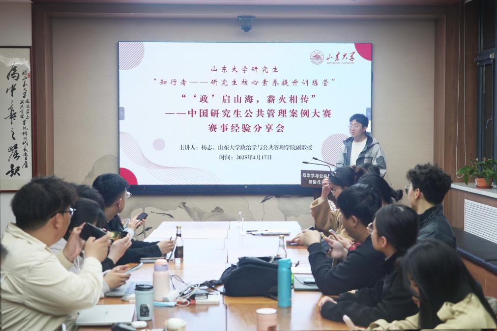 杨志围绕“公共管理案例大赛备赛经验与案例研究方法”这一主题,讲述了赛事背景、学院过往成绩、备赛策略及案例撰写要点四部分内容。其中,他特别指出“小切口大问题”的选题原则,强调案例需兼具典型性、创新性与故事性。同时,他还从团队协作角度,提出成员需优势互补,注重与指导老师的良性互动,以及学院在组织层面提供的调研、打磨文本等支持。此外 杨志进一步强调参与赛事要以“超前规划、全程投入”为准则,在选题中挖掘中国治理实践中的“山东经验”,将理论分析与案例故事深度融合。讲座最后,他鼓励同学们享受备赛过程,在团队协作中锤炼能力,既要以“代表山大”的责任感全力拼搏,也需以积极心态面对挑战,在案例研究中践行公共管理学科“理论联系实际”的核心追求。