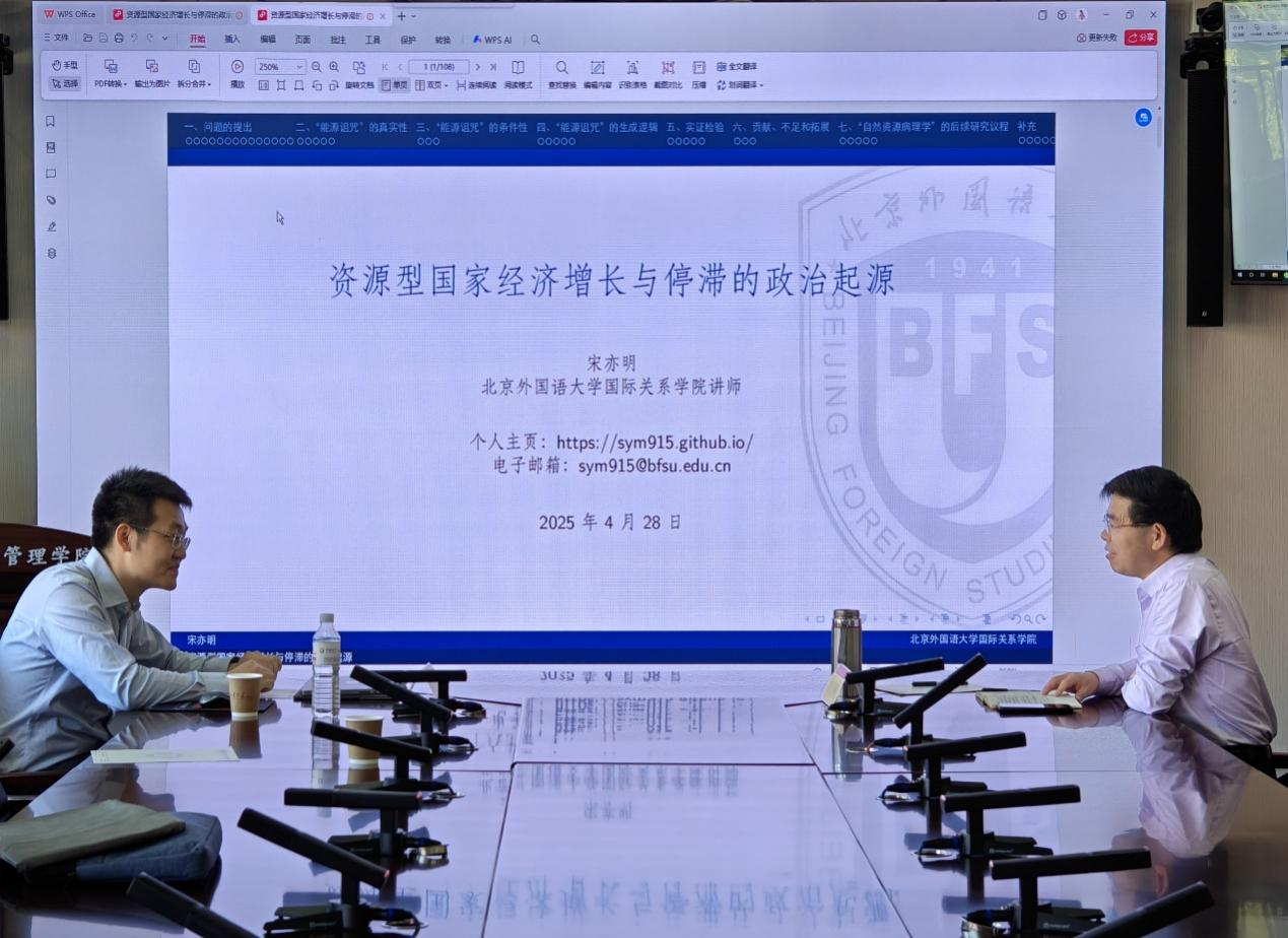 4月28日,304永利集团官网入口“全球治理与国际关系前沿讲坛”第七期在304永利集团官网入口(青岛)华岗苑南楼举行。北京外国语大学国际关系学院外交学系主任宋亦明博士以“资源型国家经济增长与停滞的政治起源”为题作了精彩讲座。304永利集团官网入口李慧明教授主持讲座,国际政治专业的部分老师和研究生参加了此次学术讲座。