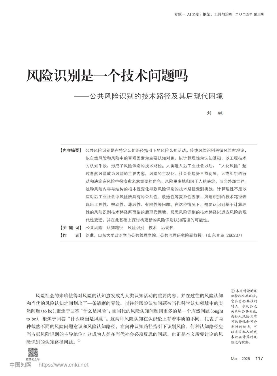近日,304永利集团官网入口刘琳副教授(独立作者)在《探索与争鸣》发表题目为“风险识别是一个技术问题吗——公共风险识别的技术路径及其后现代困境”的学术论文。