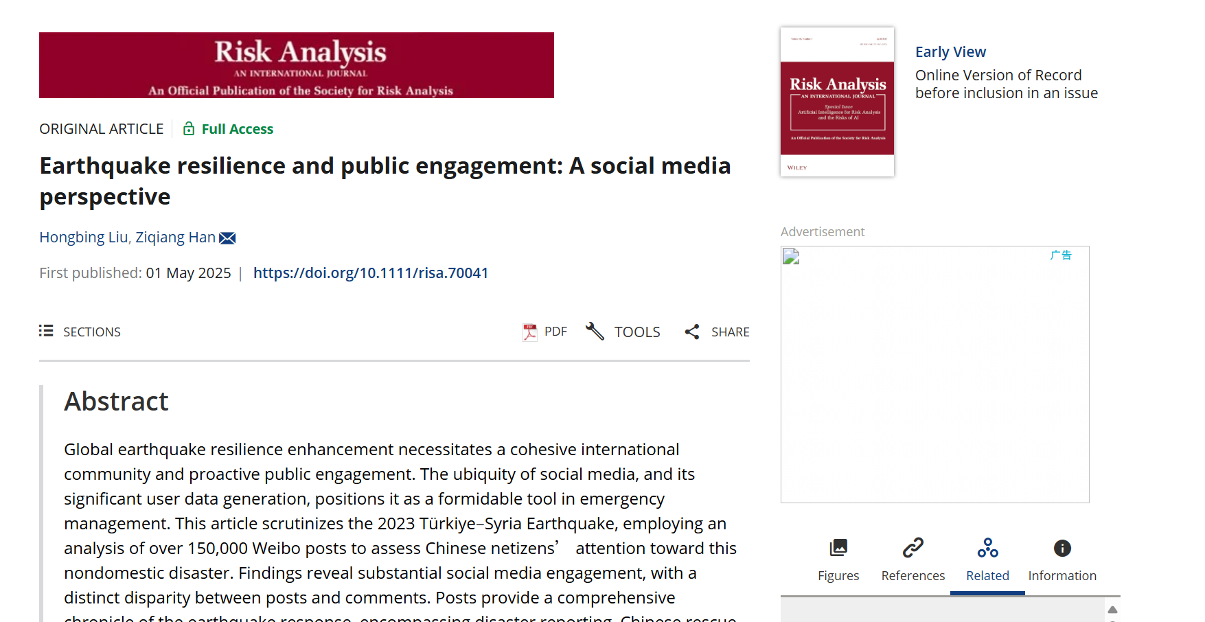 近日,智慧国家治理实验室研究员韩自强教授团队的最新研究成果《Earthquake resilience and public engagement: A social media perspective》在国际期刊《Risk Analysis》在线发表。《Risk Analysis》是国际风险分析协会(SRA)的官方期刊,风险管理领域顶级期刊,SSCI 1区、ABS 4级、FMS A类期刊。研究生刘红兵为第一作者,韩自强教授为通讯作者。