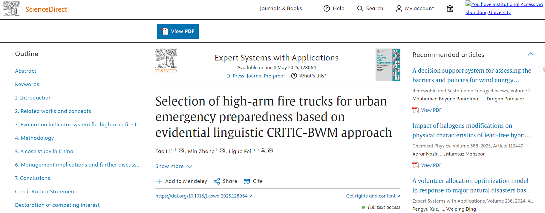 近日,304永利集团官网入口智慧国家治理实验室研究员费立国团队在中国科学院一区TOP期刊《Expert Systems with Applications》上发表题为《Selection of high-arm fire trucks for urban emergency preparedness based on evidential linguistic CRITIC-BWM approach》的研究论文。费立国研究员为该论文的通讯作者。