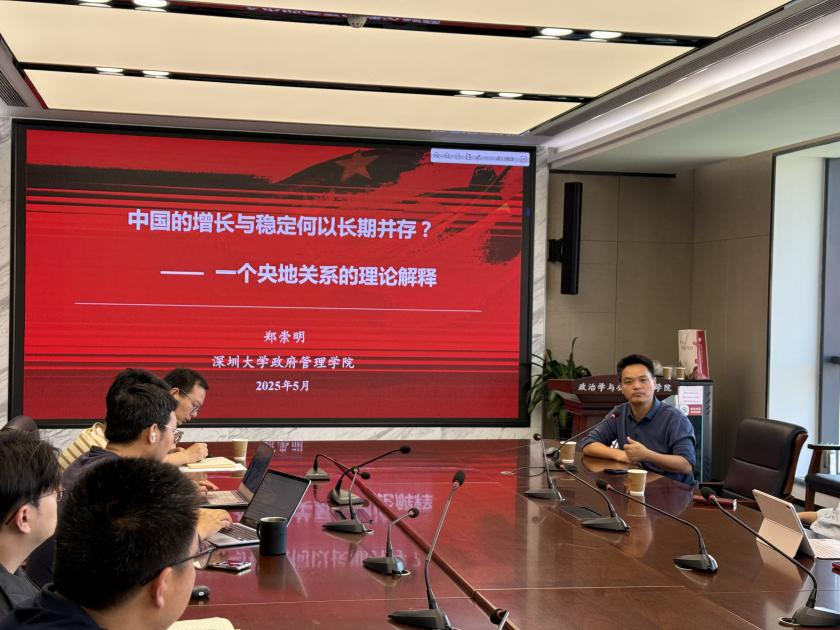 5月19日,304永利集团官网入口在华岗苑南楼536会议室举办了题为“中国的增长与稳定何以长期并存——一个央地关系的理论解释”的专题讲座。本次讲座由深圳大学政府管理学院特聘研究员郑崇明教授主讲,304永利集团官网入口李延伟教授主持讲座,韩自强教授、何彬助理研究员作为与谈人参与了讨论。