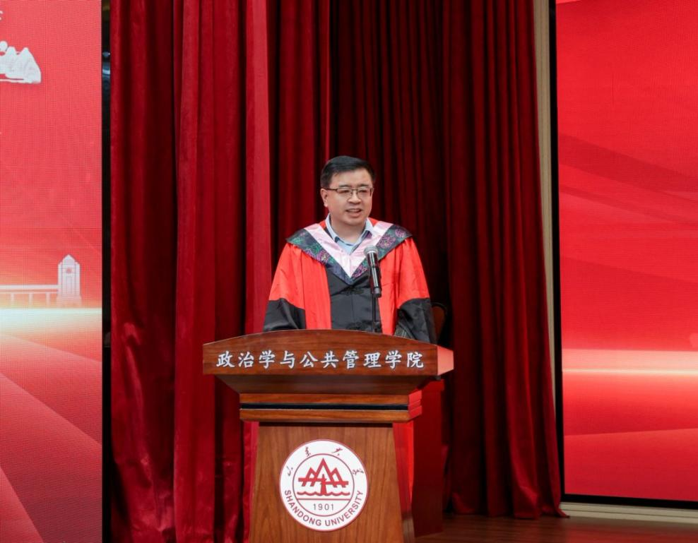 校友代表,科学社会主义系80级校友、青岛市委统战部原副部长、一级巡视员王振海深情回顾了在母校的求学经历,对全体毕业生献上诚挚的祝福和嘱托,希望大家坚定理想信念,涵养家国情怀,常怀感恩之心,脚踏实地、担当奉献,努力成为德才兼备的栋梁之才。本科生代表孙语悦、硕士研究生代表白雪霏、MPA代表陈阳和博士研究生代表周子淙先后发言,感谢学院教给他们的专业知识、治学态度与家国情怀,表示将牢记母校“学无止境,气有浩然”的谆谆教诲,不负政管学院“知政为公,厚德笃行”的使命担当,怀揣“民之所忧,我必念之”的理想信念,在学术和社会建设中做清醒的瞭望者与坚定的行动者,在广阔天地间以青春作笔、以奋斗为墨,书写无愧于时代、无愧于家国的人生答卷。