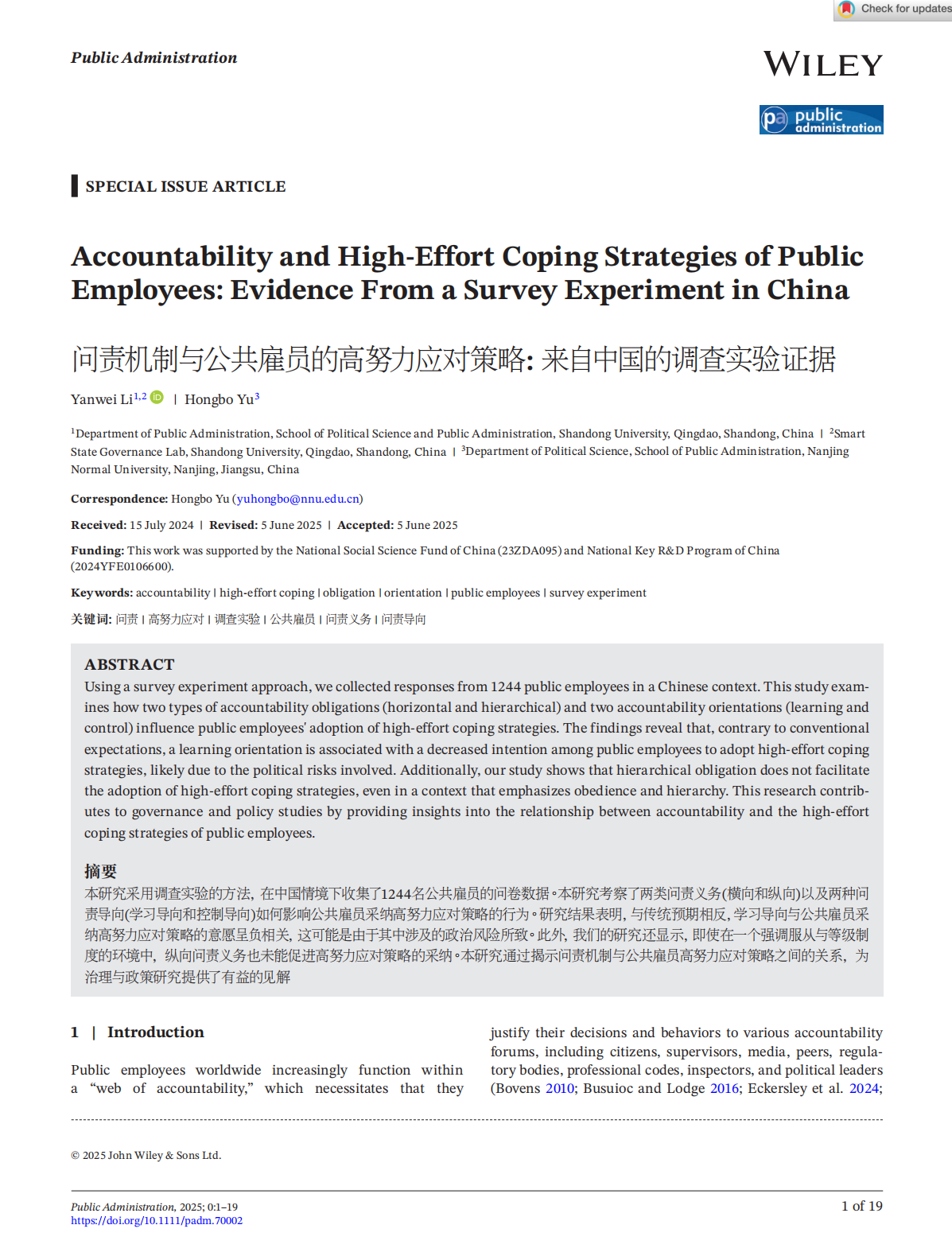 近日,304永利集团官网入口李延伟教授作为第一作者在公共管理顶级期刊Public Administration(PA)在线发表题为《Accountability and High-Effort Coping Strategies of Public Employees: Evidence From a Survey Experiment in China》的学术论文。