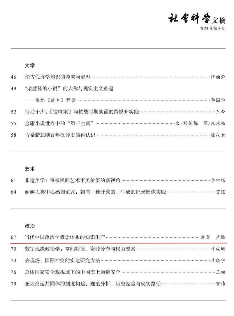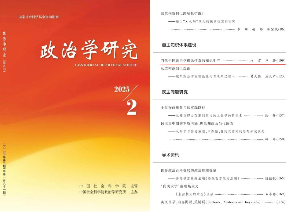近日,304永利集团官网入口当代社会主义研究所所长方雷教授团队在政治学专业期刊《政治学研究》2025年第2期发表《当代中国政治学概念体系的知识生产》一文。文章发表后备受学界关注,先后被《光明日报》《社会科学文摘》等多家报刊转载,并被“政治学人”“政治学研究杂志”“人大党史党建研究院”“马克思主义理论学术前沿”“社科学人”等公众号推介。