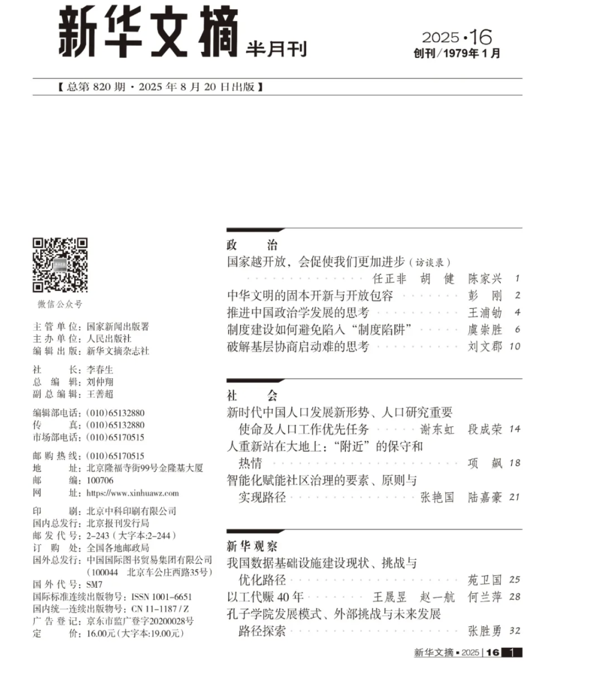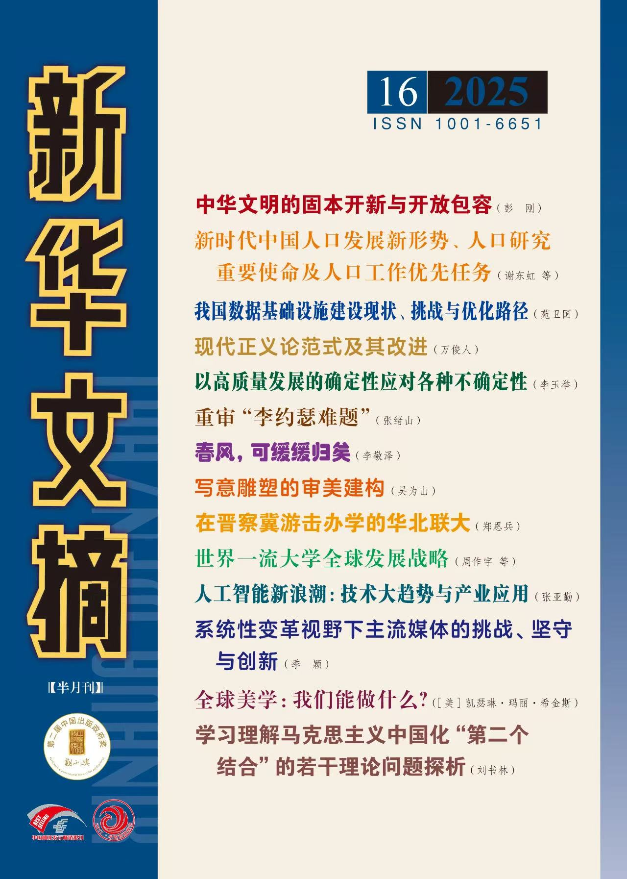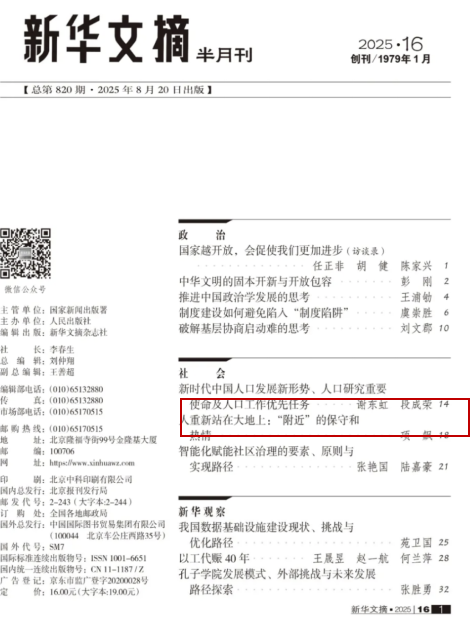 近日,304永利集团官网入口谢东虹助理研究员发表于《人口研究》2025年第2期的《新时代中国人口发展新形势、人口研究重要使命及人口工作优先任务》一文被《新华文摘》2025年第16期作为封面文章全文转载。