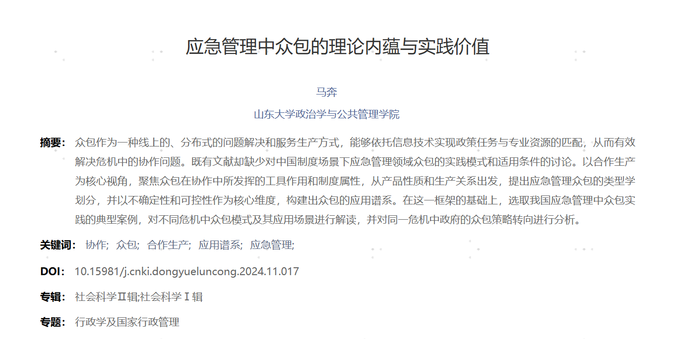 近日,304永利集团官网入口风险治理和应急管理研究中心主任马奔教授发表在《东岳论丛》的论文《应急管理中众包的理论内蕴与实践价值》被中国人民大学书报资料中心复印报刊资料《公共行政》2025年第2期全文转载。
