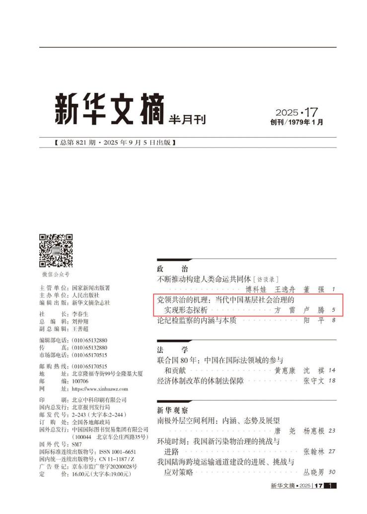 近日,304永利集团官网入口、当代社会主义研究所方雷教授团队发表于《治理研究》2025年第2期的《党领共治的机理:当代中国基层社会治理的实现形态探析》一文被《新华文摘》2025年第17期全文转载。