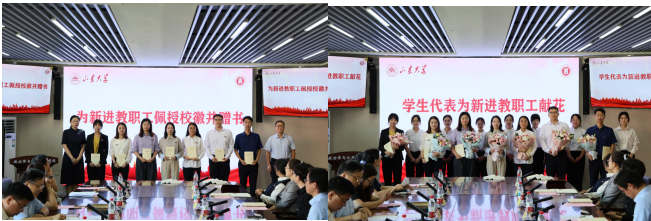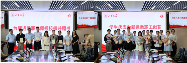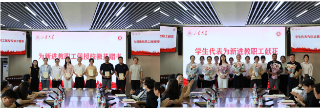 仪式伊始,学院领导班子成员为新进教工佩戴校徽并赠送书籍,学生代表为新进教工献花。