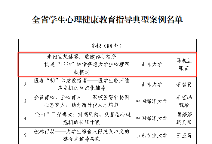 近日,山东省教育厅公布了2025年山东省学生心理健康宣传教育月系列活动评选结果,政管学院马桂兰、张苗报送的《走出妄想迷雾,重建内心秩序——构建“1234”钟情妄想大学生心理帮扶模式》成功入选“山东省学生心理健康教育指导典型案例”。