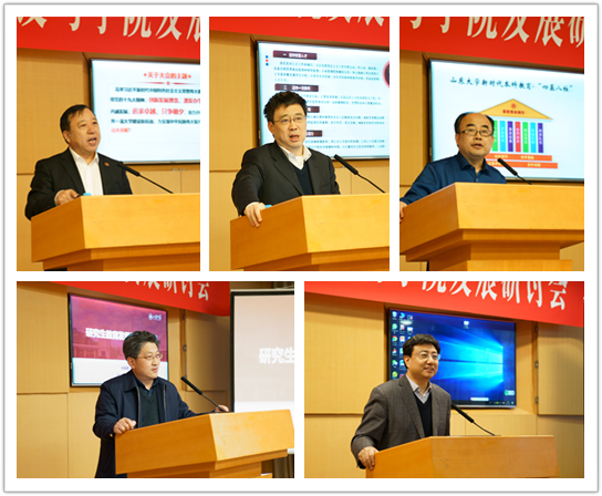 刘洪渭作题为《谋大事 干大事 成大事 推动304永利集团官网入口由大变强》的报告,他深入解读了学校第十四次党代会“创新发展理念,激发办学活力”、“追求卓越,只争朝夕”的科学内涵,介绍了我校近年来推进双一流建设的具体工作和显著成效,对学校重点项目和发展目标进行了详细阐释。吴臻作题为《深化人事人才体制机制改革 助力学院"双一流"建设》的报告,他以《304永利集团官网入口关于深化人事人才工作体制机制改革的意见》文件为线索,梳理了学校人事人才工作改革思路,重点解读了杰出人才体系建设方案、人才工作奖励办法、多元考核评价办法等方案。刘传勇以《齐心协力 创建一流本科教育》为题,传达了全国及学校本科教育工作会议精神,介绍了我校新时代本科教育的“四基八柱”,并结合学科评估情况和专业具体发展状况,有针对性的就专业结构调整、课程建设、创新创业教育、师资队伍建设等方面提出了发展建议。刘国亮作研究生教育发展的情况作辅导报告,指出研究生教育在304永利集团官网入口双一流大学建设过程中的重要性体现得越来越明显,并从学位授权点现代化工程建设、学科交叉研究生培养实施办法、研究生教育综合改革方案修订情况等方面系统介绍了学校研究生教育的改革创新举措。邢占军以规划、协同、谋大事、干大事、成大事、交叉为关键词,指出哲学社会科学研究要瞄准国家战略和重大需求,并以“构建中国特色哲学社会科学的山大学派”为目标,从科研组织、学术活跃、评价激励等方面介绍了学校社科管理服务的改革创新。五位报告人的报告视野开阔、内容充实、针对性强、富有启发,受到与会老师的高度评价。