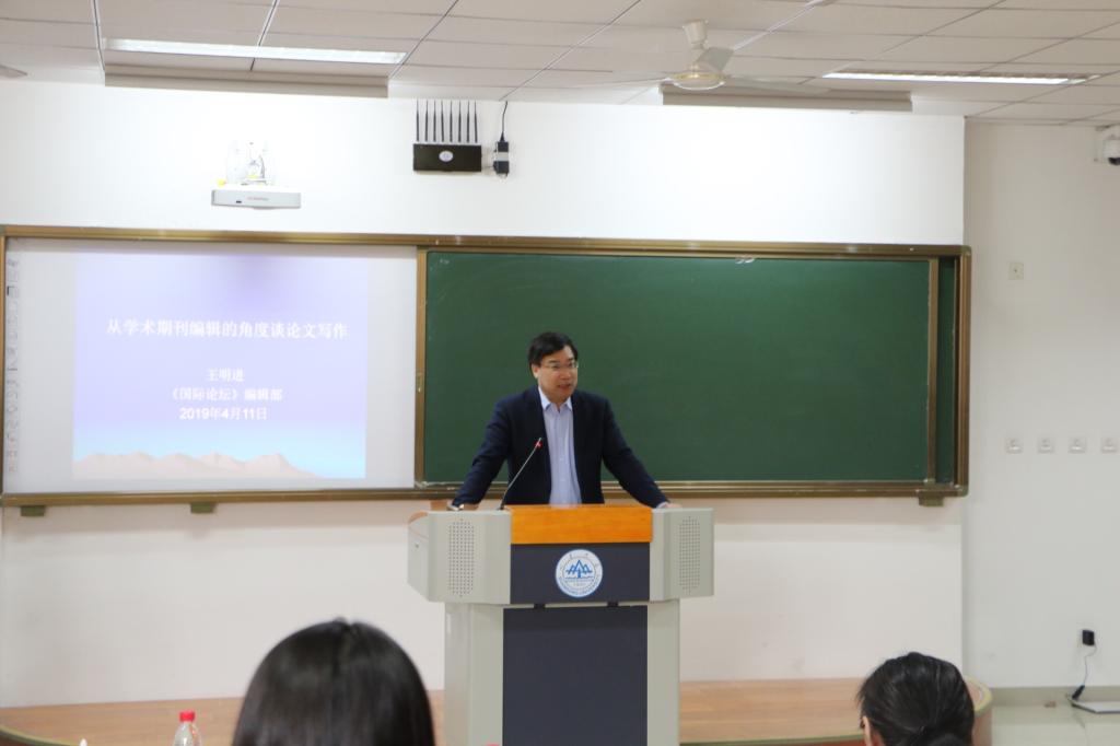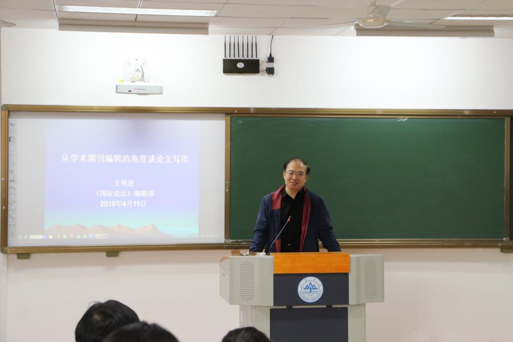 4月11日下午,北京外国语大学国际关系学院教授、副院长,《国际论坛》副主编王明进应邀做客政管学院研究生学术讲坛,并作了主题为“从学术期刊编辑的角度谈论文写作”的讲座。本次讲座由学院副院长刘昌明教授主持,五十余名师生参加。