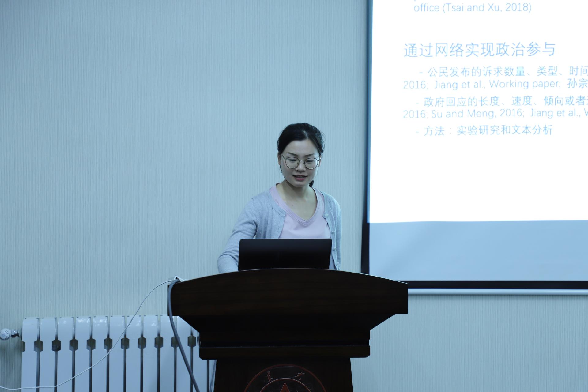 最后,李珍珍博士汇报了主题为“公众网络政治参与的表达模式:选择公开与重复参与”的研究成果。其研究采用文本研究的方法,对青岛市市长信箱进行了数据爬取和分析,最终发现公众在使用政务平台的过程中,对于公共问题更加倾向于公开,同时公民也会多次重复使用政务平台进行政治参与。
