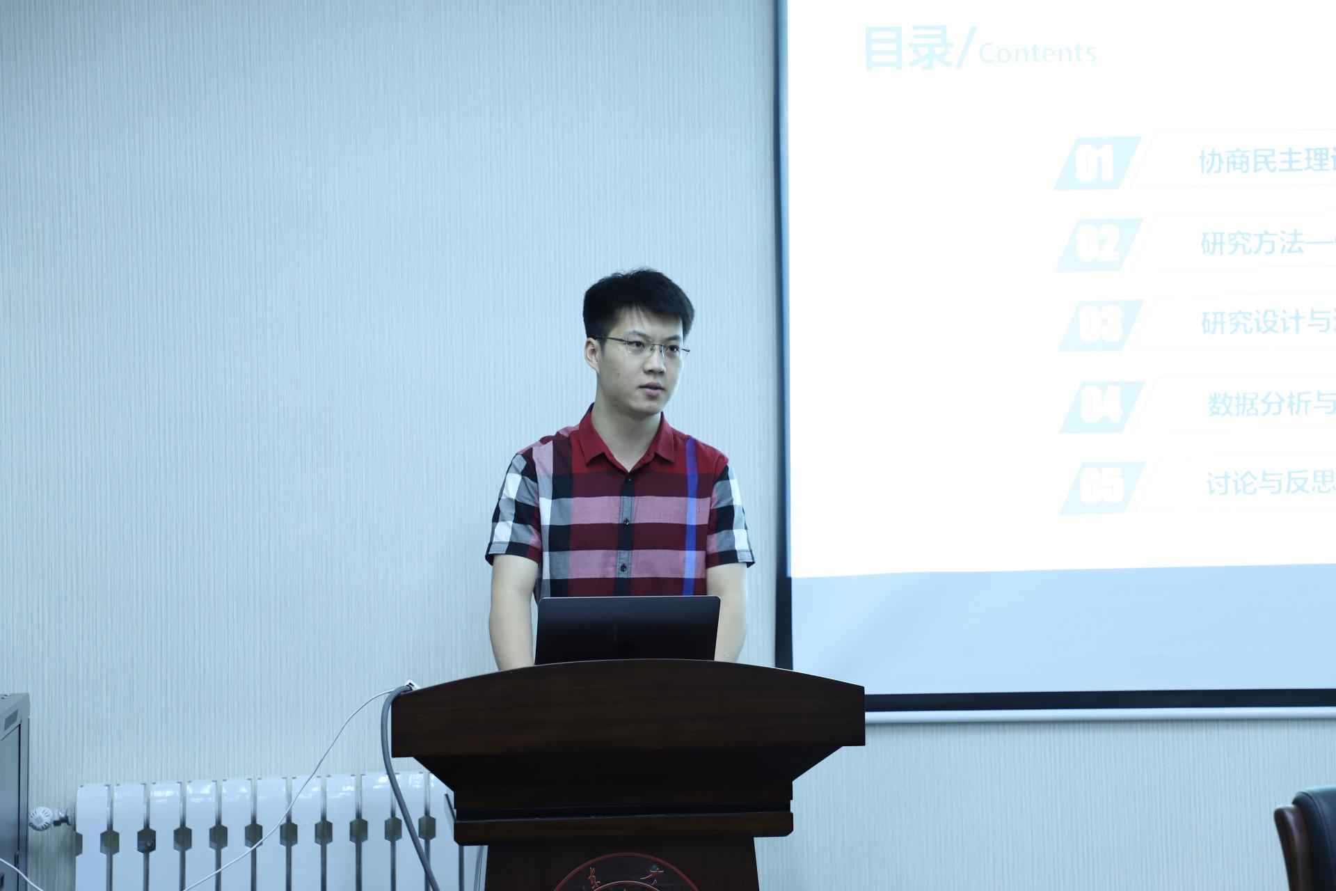 首先,2018级博士研究生边琦介绍了其团队关于中国式基层协商民主的认知的研究。其研究运用Q方法对随机抽取的济南市某区40位居民进行了基层协商民主认知测量,最终通过数据分析提炼出中国基层协商民主认知模型的四大类别。