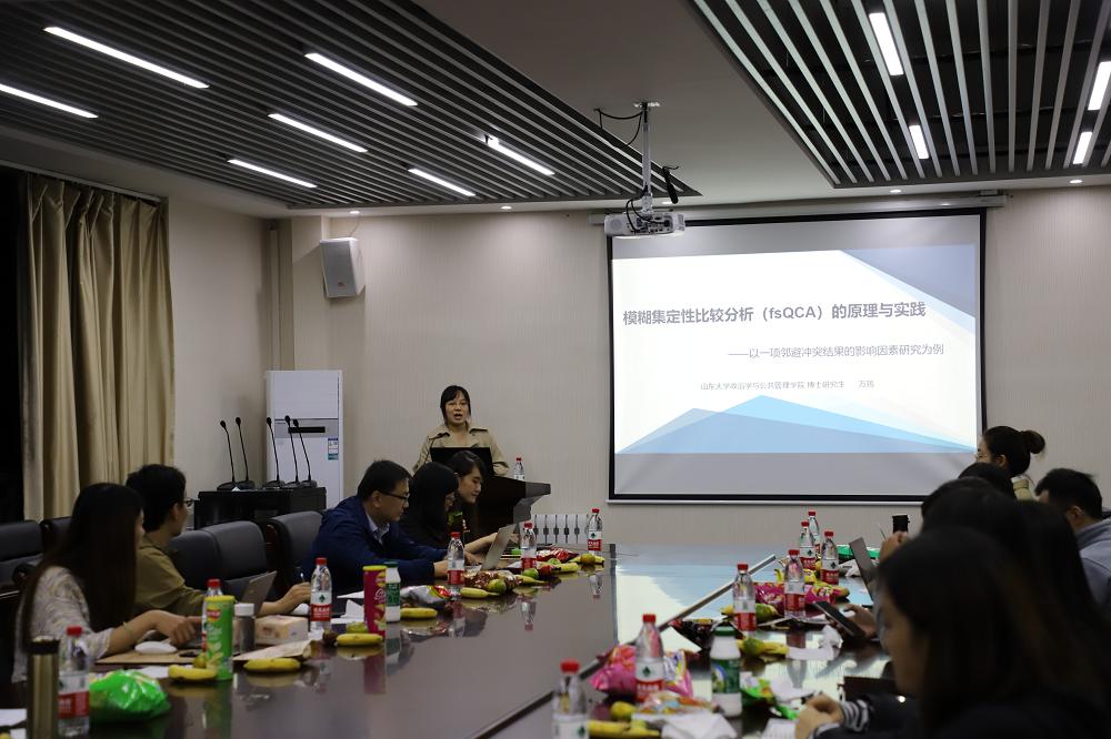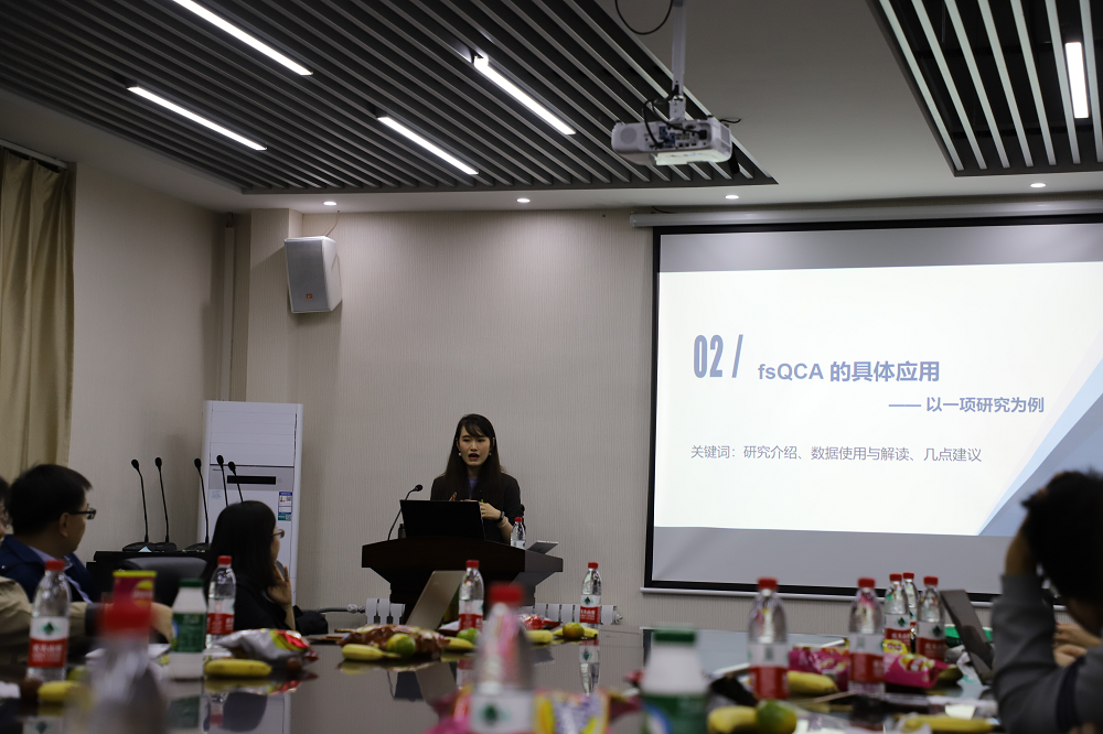 沙龙开始,政管学院万筠博士分享了题为“模糊集定性比较分析(fsQCA)的原理与实践——以一项邻避冲突结果的影响因素研究为例”的研究。万筠博士首先从集合论思想、多案例研究、布尔代数算法等方面介绍了定性比较分析的基本原理与基本逻辑,并详细介绍了定性比较分析的优缺点,然后通过一项具体研究来展示fsQCA如何与邻避冲突结果影响因素的研究进行有机结合,最后针对多案例如何进行数据的收集、筛选、运算和结果解读提供了相关建议。