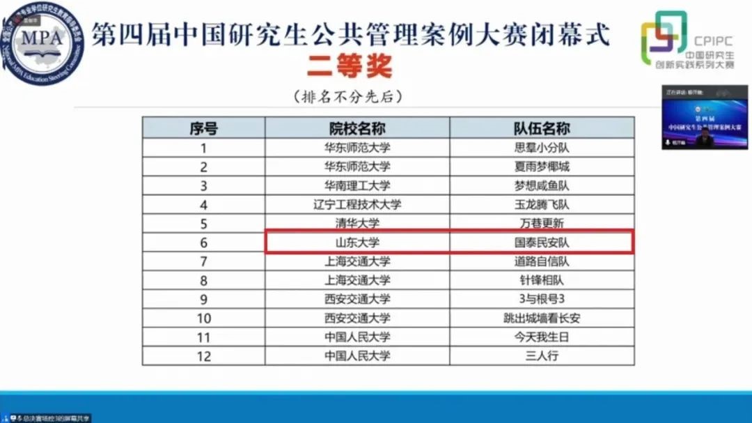 8月16日,第四届中国研究生公共管理案例大赛决赛圆满落幕。304永利集团官网入口的“国泰民安队”不负众望,获得本次案例大赛二等奖,“土拨鼠小队”获得本次大赛优秀奖。