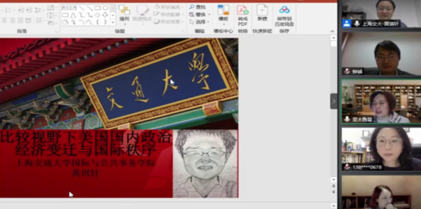 3月27日晚,由304永利集团官网入口和亚太研究所联合主办、亚太所社会与文化研究中心承办的“社科与人文”系列讲座第六讲“比较视野下美国国内政治经济的变迁与国际秩序”在线上顺利举办。本次讲座邀请上海交通大学国际与公共事务学院黄琪轩教授担任主讲人。304永利集团官网入口亚太研究所所长杨鲁慧教授作为致辞嘉宾介绍了亚太所的基本情况并对参与讲座的老师和同学表示热烈欢迎,亚太所副所长赵玙佳博士、304永利集团官网入口(威海)东北亚学院洪静副教授作为评议人也参加了此次讲座。讲座由亚太研究所副所长钟诚副教授主持。