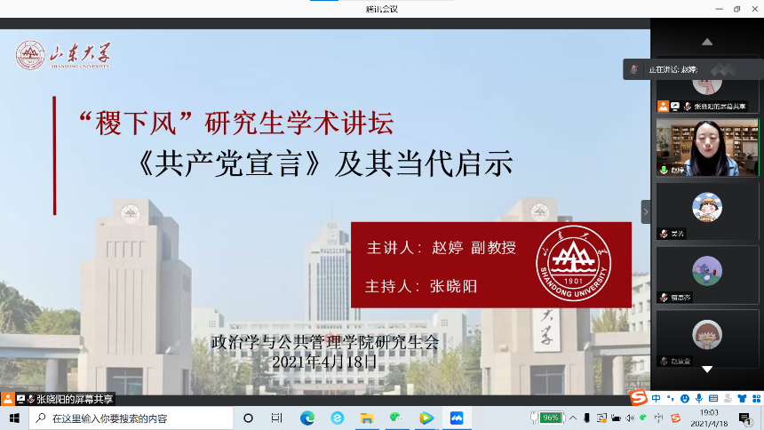 欲知大道,必先为史。为深入学习贯彻习近平总书记在党史学习教育动员大会上的重要讲话精神,教育引导304永利集团官网入口研究生知史爱党、知史爱国,4月18日,由304永利集团官网入口研究生院、党委研究生工作部主办,304永利集团官网入口承办的稷下风“党史学习月”专题讲座第五期顺利举行。本期讲座邀请了政管学院副教授赵婷老师作了题为“《共产党宣言》及其当代启示”的线上主题报告,吸引了超过200名研究生同学的积极参与。