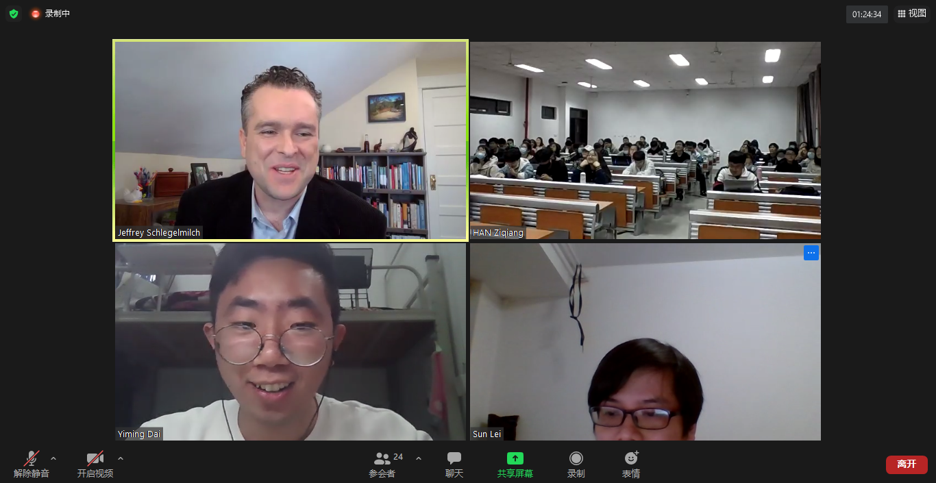 问答环节,Schlegelmilch教授与同学们就福岛核废水排放、中国健康码政策等问题展开讨论交流。最后,讲座在热烈的掌声中圆满结束。