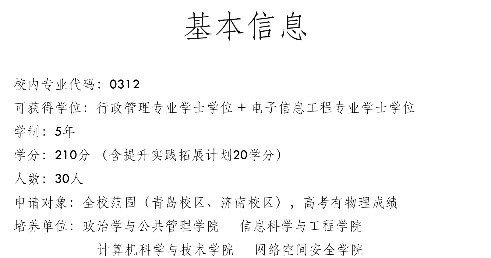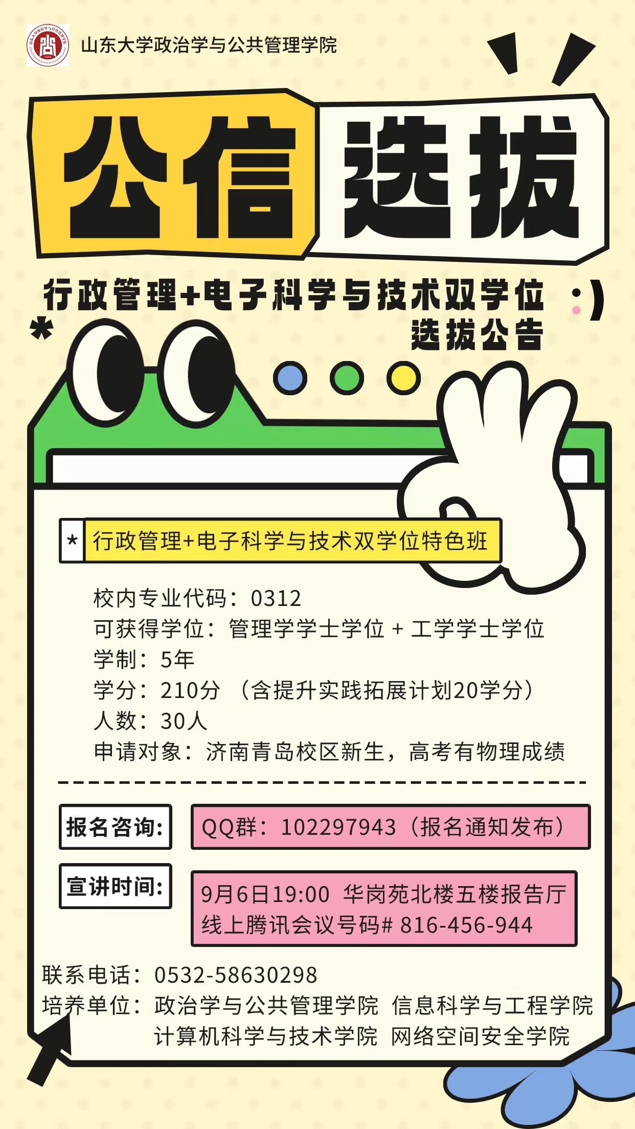 为适应社会发展趋势,满足人才市场的需求,培养具备管理能力并能够熟练运用信息科技辅助政府决策与公共治理的高端复合型人才,304永利集团官网入口将面向我校2024级本科新生选拔“行政管理+电子科学与技术双学位”专业的学生。具体信息如下: